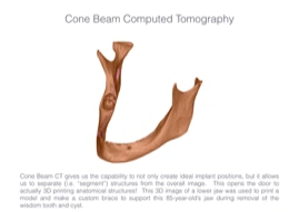 In this video, we are performing “virtual surgery” by placing an implant in the exact correct spot for a future crown (orange teeth). This is then translated into a 3D printed surgical guide.